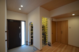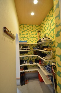 リフォーム後![]() 家族の靴もスッキリ収納できるシューズクロークを設けました。 ![]() POPなクロスで明るい印象のシューズクロークは棚式で収納力UP |