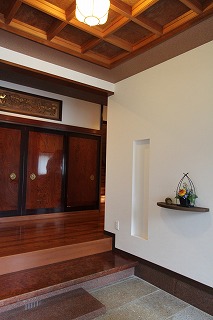 リフォーム後![]() 重厚な趣の玄関空間 ![]() お父様が大切にされていた鏡戸と欄間を再利用しました。玄関からの光が欄間を通ってリビングへも入ります。 |