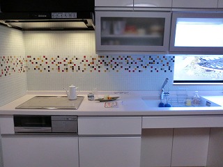 リフォーム後![]() 若世帯のダイニングキッチン。 ![]() キッチンにはモザイクタイルを施しました。 |