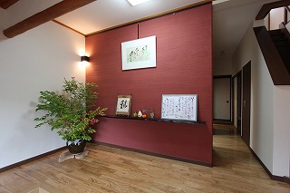 リフォーム後![]() 能登産の珪藻土を使用しました。調湿作用があるので体に優しいです。無垢板を利用した飾棚も設け、お気に入りの書や小物を飾ることができます。 |