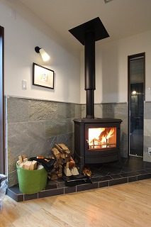 - 念願の薪ストーブを設置しました。薪ストーブ周りには石を施工し、蓄熱効果があり薪ストーブを消したあともあたたかく過ごすことができます。