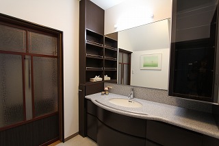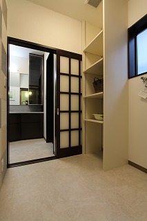 リフォーム後![]() ゆったりとした洗面室。リメイクした建具が活きるレトロモダンな空間となりました。 |