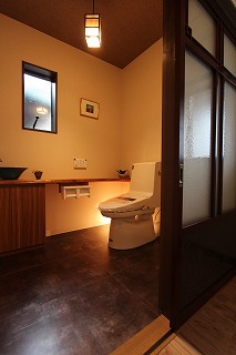 リフォーム後![]() ゆったりと落ち着くトイレ空間。保管されていた無垢板もトイレカウンターとして利用しました。 |
