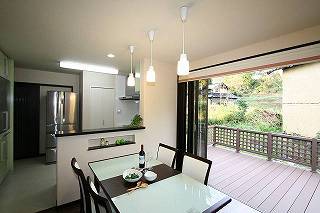 リフォーム後![]() ダイニングキッチンの横にはウッドデッキを設け、全開口サッシを開放しバーベキュー等楽しめる事で、山の中の自然を活かしたダイニングキッチンに仕上がりました。 ![]() |