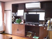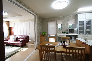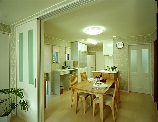 リフォーム後![]() 並列型のキッチンをご提案。カウンター上や横につながったテーブルが作業台となり、調理がしやすくなりました。台所と居間の間は目的に応じて仕切れるように、3枚引き戸をご提案。 |
