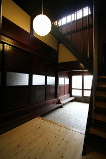 リフォーム後![]() 玄関の土間部分に玄関ホールを新しく設け、玄関からの段差を低くしました。丸い和紙を使った照明が既存部分とも調和し、優しい灯りがお客様を出迎えます。 |