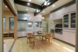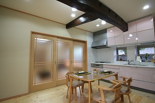 リフォーム後![]() キッチンはリビングとも調和する淡いピンク色を使用しました。収納ユニットでスッキリと片付きます。 ![]() 太い梁の濃い茶色が淡い色合いの中、アクセントとなっています。 |