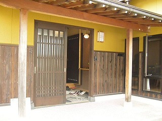 リフォーム後![]() オリジナル玄関戸、天井部分はヨシアジロ、土間部分は自然石乱張しました。古民家調とモダンを組み合わせたコーディネートです。無垢板を使った飾棚もお客様の目を楽しませます。 ![]() 内玄関。収納も充実しているので、玄関はいつでもスッキリとした印象です。 |