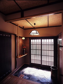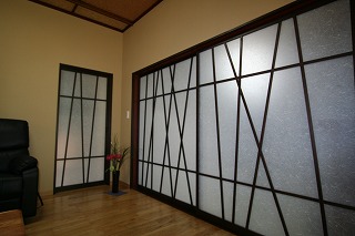 - 奥様と一緒に、建具や竹の演出をひとつひとつ考えました。古材風の格子建具で空間をしっとり演出しました。