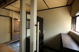 - 茶室風の縁側にしました。緑を愉しみ、お客様をもてなす空間としました。