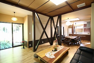 - 隣りにあるご主人の趣味を楽しむ囲炉裏小屋につながるLDKとしました。