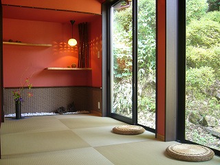 リフォーム後![]() 茶室風の縁側に...。たたみフロアタイルを市松模様貼りし、広縁奥には白玉石敷き・黒竹もあしらい、癒しの演出をしました。自然の緑も愉しめ、お客様をもてなす空間となりました。 |