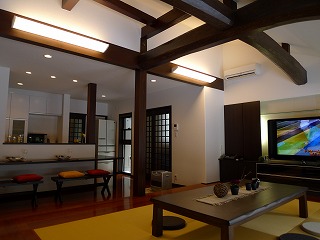 リフォーム後![]() LDK空間はご主人のあこがれの和ダイニング風に仕上げました。リビングは小上がりの畳スペース、それに吹き抜けにかかる梁がポイントです。 |