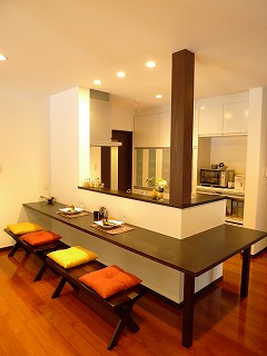 リフォーム後![]() キッチン前のカウンターは和ダイニング空間の象徴。コミュニケーションもよくとれます。 |