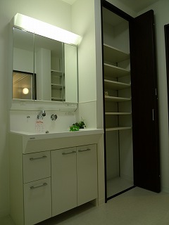 リフォーム後![]() 収納にこだわった洗面脱衣室。大容量の収納は他に扉なし収納もあり、タオル、買い置きの洗剤などスッキリと片付けることができます。 |