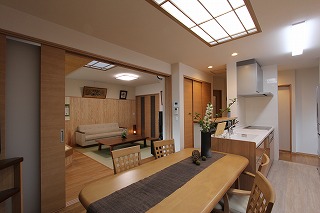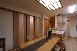- リビングとDKの間は1間半の3枚引き込み戸を設け、季節によって間仕切りを調節できるプランとしました。
