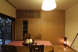 リフォーム後![]() 中庭に面した、ゆったりとしたダイニングスペース。 ![]() 壁一面分の大容量の収納。 ![]() ダイニングからつながる縁側に腰をおろし、四季の移り変わりを楽しむことができます。 ![]() ダイニングスペース収納は一部をガラスとし、見せる収納としました。 ![]() 冷蔵庫をダイニングから見えないように目隠しを設けました。/p> |