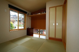 リフォーム後![]() 縁なしの畳を市松敷きしているので、リビングとつなげて使う際も程よく調和します。 |