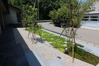 リフォーム後![]() 植え込みを切り崩し、道路面にグランドラインを合わせ、家全体がすっきりと見えるアプローチ計画としました。 ![]() 東福寺の庭園をモチーフとし、デザインした植え込み |