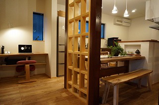 - リビングとダイニングキッチンをひとつの空間にしました。間にある抜けない柱にピッタリと合わせて、耐震性のある格子を組み立てました。