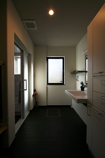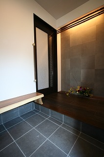 リフォーム後![]() 玄関スペースにはベンチを設けました。玄関正面壁には薄墨和紙を貼り、床の間風飾り棚でおもてなしを表現しました。 ![]() 玄関収納も充実させました。 |