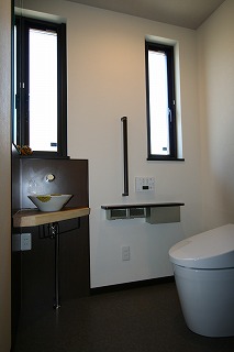 リフォーム後![]() 車椅子にも対応できるスペースを確保。九谷焼の手洗いボウルがポイントです。 |