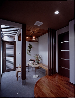 - 玄関は、畳1畳分増築し、バーベキューコーナーを設けた。天井には、トップライトを設け、光がこぼれる空間とした。