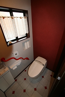 リフォーム後![]() トイレは、一目見て気に入った赤い曲線の手すりを使いたいとのご要望で、手すりに合わせて、赤のポイントタイルと、クロスの貼りわけをご提案。 |