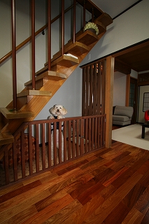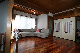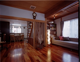 - LDKは、洗面・風呂への使い勝手や、収納計画及び採光を考慮しプラン。コーディネートについては、無垢のかりんの床材をご提案し、和室や天井など既存部分(和風)との調和に最大限に配慮した。