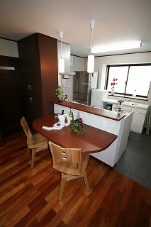 リフォーム後![]() 対面キッチンにはRでデザインした造作テーブルとカウンターを。 |