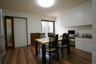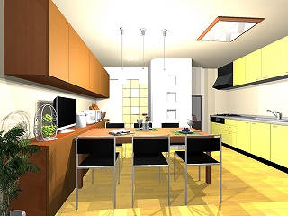 リフォーム後![]() 広々ダイニングキッチン。家族6人でもひろびろダイニング。4人の娘さんもお手伝いできます。 ![]() ダイニングの向こうにはウッドデッキとリビングがうかがえます。 ![]() 3D提案時。 |