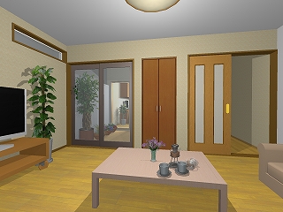 リフォーム後![]() 居間から見えるウッドデッキとダイニングキッチン。リビングからもダイニングの様子がうかがえます。来客時もダイニングと分かれている為、それぞれ、ゆっくり気兼ねなく寛げます。 ![]() 3D提案時。 |
