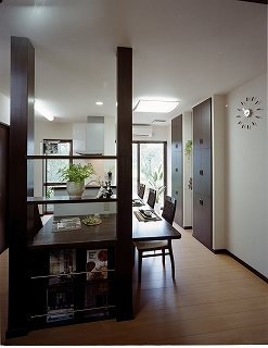 リフォーム後![]() ダイニングキッチンを北側に配置しリビングに北の風が通るように ![]() 居間へは引分け戸を付ける事で開放感ができた ![]() 抜けない柱もキッチンの目隠し棚に変更 |