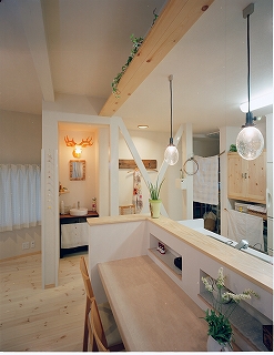 - 玄関の段差を少なくし、正面は飾りカウンターとクロスのデザイン貼りでアクセントをつけた。