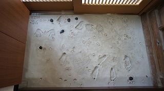 リフォーム後![]() 家族用の裏玄関を設けることで、玄関がスッキリしました。 ![]() 裏玄関の土間にはお孫さんの手形や足形。リフォームの記念、そして可愛い想い出としてもしっかり残すことができます。 ![]() こちらは下足棚です。既存の建具をリメイクし、味わいのある玄関ホールとなりました。 |