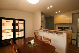 リフォーム後![]() 対面キッチンとなり、コミュニケーションも増えました。 ![]() ダイニングキッチンとリビングをわけつつ、共にオリジナル建具が空間のポイントなり、繋がりを感じるようデザインしました。 |
