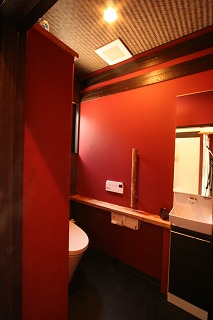 リフォーム後![]() 金沢の伝統色である朱壁や天然木を利用した手摺り、カウンターを用いたトイレ空間。高級感があり、落ち着ける空間となりました。 |
