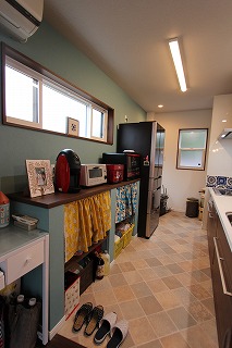 リフォーム後![]() 1階キッチンはモロッコ調の空間を引き締める落ち着いた色合い。床はお手入れ面も考慮した石目調のクッションフロアとしました。キッチンの壁にはお客様が見つけられたタイルをはり、アクセントに。 ![]() キッチンには既製品の収納をあえてつけず、OPENな棚をつくりました。目隠しのカフェカーテンにはカラフルな色を使いました。 ![]() 2階キッチン。カフェ風のカウンターは裏が食器収納となっています。 |