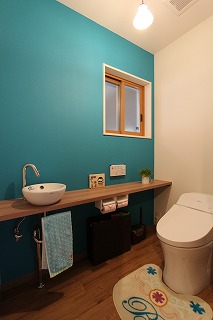 リフォーム後![]() 1階トイレ。壁の鮮やかなブルーとカウンター、床のナチュラルな茶色とベストマッチ。 ![]() 2階トイレ。色味を押さえたナチュラルな空間。 |