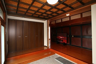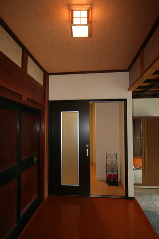 リフォーム後![]() 広々とした既存の玄関の雰囲気をできる限り残してご提案しました。左側一面の玄関収納でスッキリとします。 玄関より若世帯スペースへ。 |