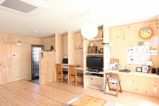 - 壁や棚は合板仕上げ、キッチンも集成材を使用し、コストを抑えつつ、使い勝手、デザイン性にこだわりました。