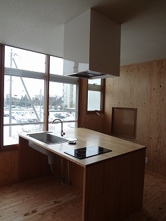 リフォーム後![]() 棚や壁も合板仕上げとし、キッチンも集成材を使用。コストを抑えつつ、使い勝手の良さとデザイン性を両立させました。 ![]() キッチンからは夕日を眺められます。 |