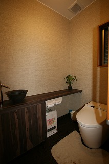 リフォーム後![]() トイレは落ち着いた色合いのゆったり空間となりました。手洗いカウンター収納ですっきり片付けられます。 ![]() 珠洲焼の手洗いボウル。 |