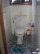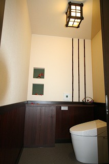 リフォーム後![]() お手洗いの腰壁に羽目板を再利用。また九谷焼の洗面ボウルを使用し、ここでも地産地消の考えを採用。 |