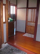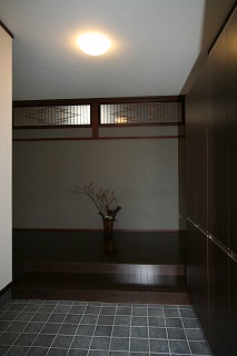 リフォーム後![]() 大きな下足箱を新たに設け、正面には飾棚、明かり採りからも優しい光が差し込み、おもてなしの空間になりました。 |