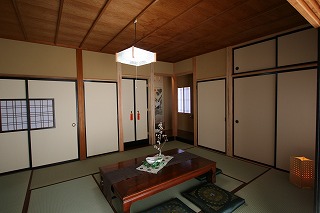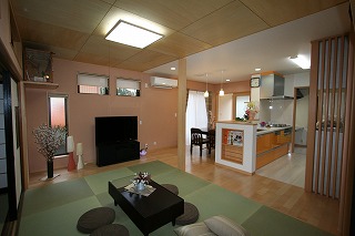 リフォーム後![]() リビングは畳スペースとし、子供たちは思いっきり遊べ、またゴロっとすることもできる寛ぎの空間となっています。隣接する仏間ともつながりをもたせています。 ![]() 思い入れのある欄間はLDKの畳コーナーに移設しました。 |