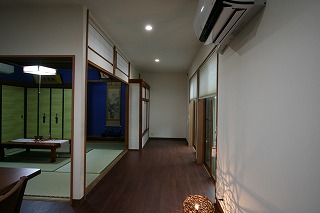 また壁を鮮やかな群青色にすることで、部屋を明るい印象にする効果もあります。 - 縁側を取り込み、細かな間仕切りを外すことで開放的なLDK空間となりました。