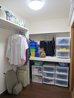 - リビング、洗面室から行き来できるファミリークローゼットを設けました。縁側を占拠していた洋服もすっきりとおさまり、また洗面室にも隣接しているので日用品の保管場所としても便利に使っていただけます。
