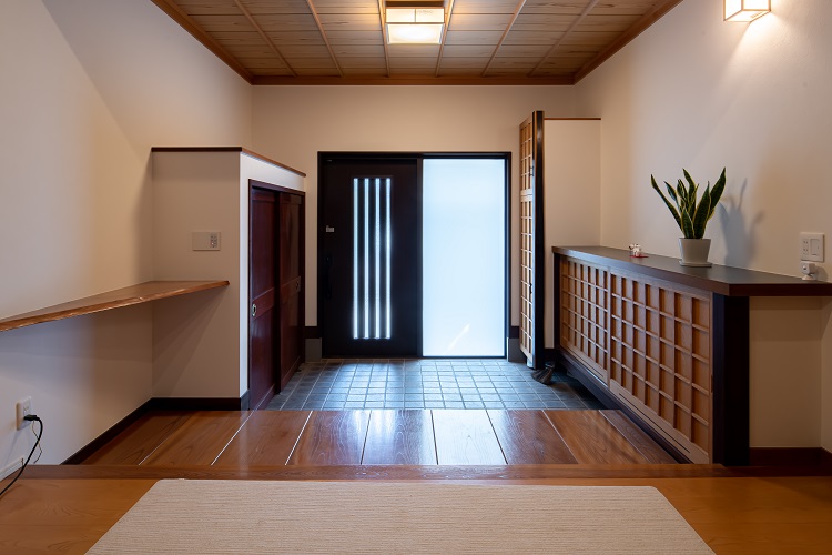 リフォーム後![]() 収納充実の玄関は、思い出を残しつつ、デザイン性にもこだわった ![]() 玄関からの来客動線は、生活エリアを通らないように配慮し、子世帯のプライバシーを確保した |