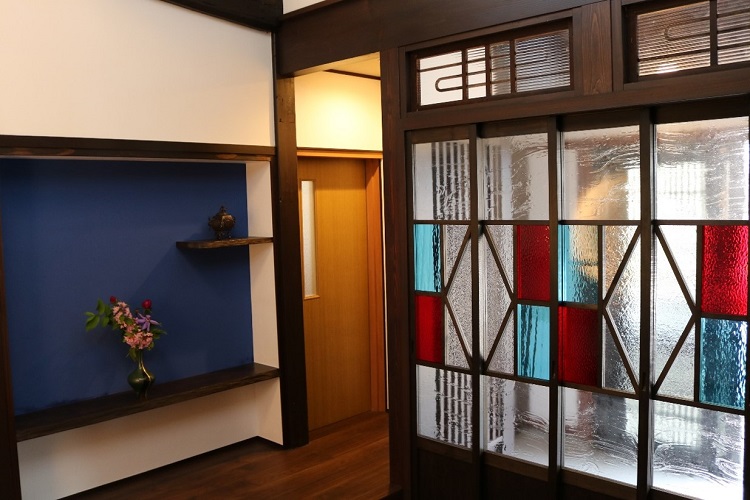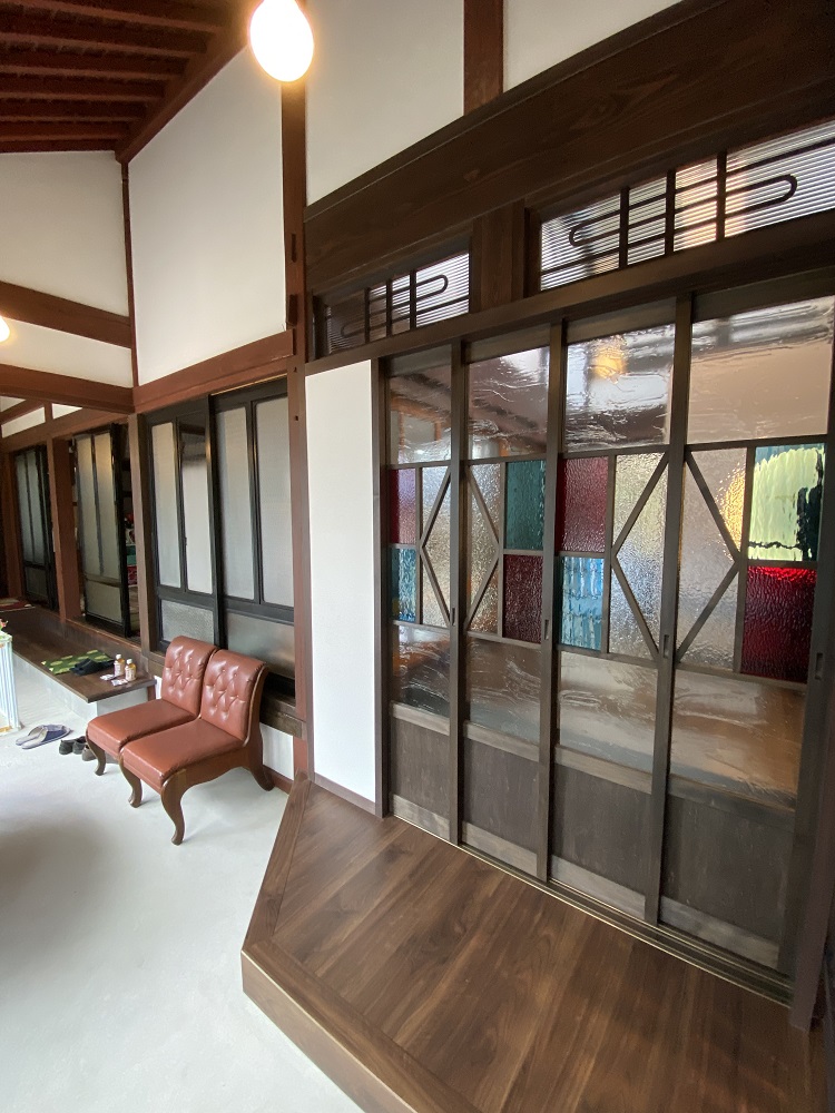 リフォーム後![]() 玄関と合わせた大正ロマン風のデザイン壁 |